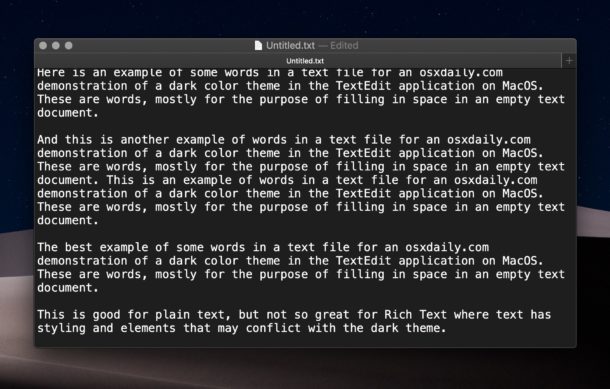This feature works fine with Plain Text documents in TextEdit, but can be a bit more problematic with Rich Text where document styling is used, with colored text and colored or highlighted backgrounds, and other stylistic features in RTF files. If you don’t like the way it looks with Rich Text documents (or in general), you can easily turn it off by unchecking the “Use Dark Background for Windows” option in the View menu.